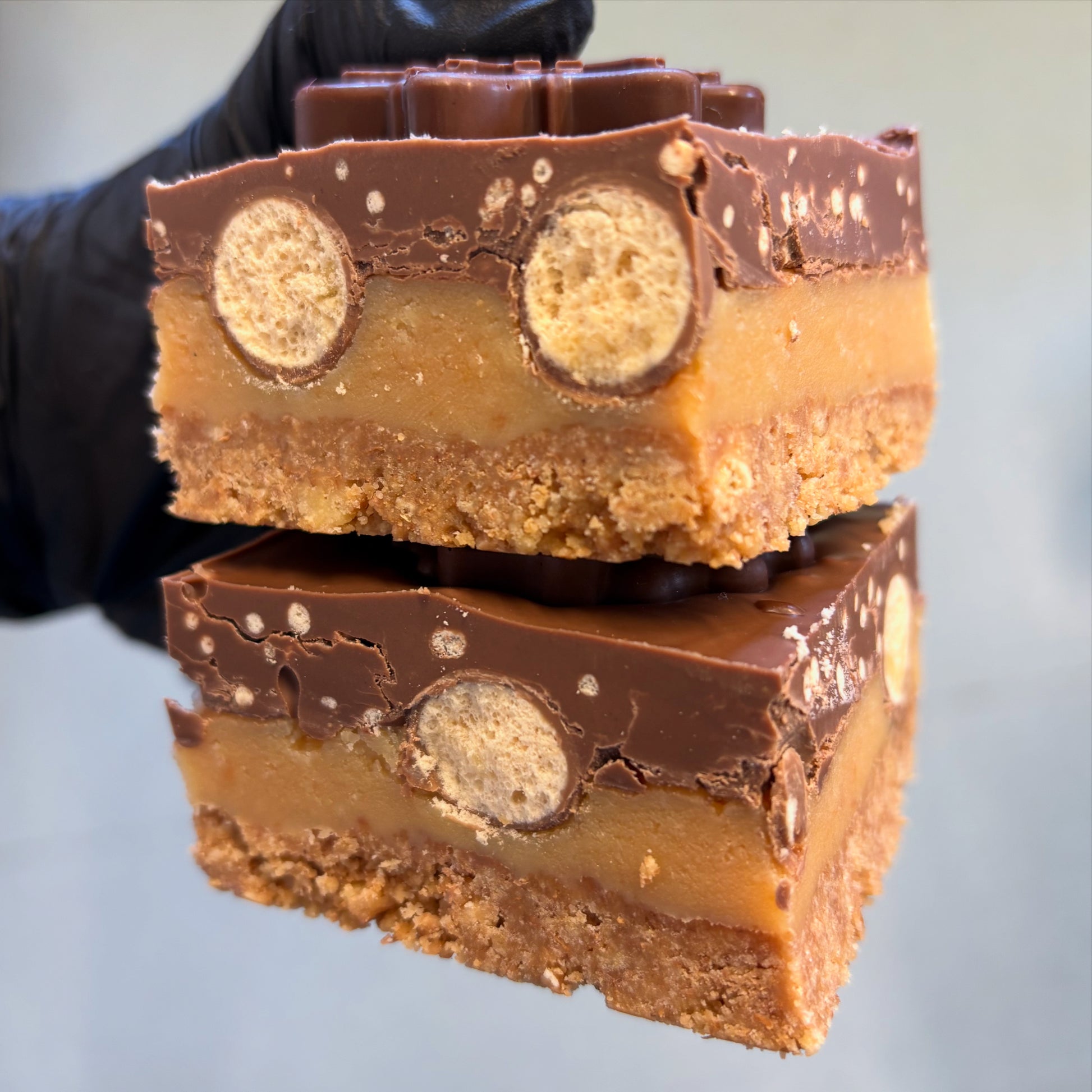 Malteser Millionaires - malty biscuit base, thick layer of caramel stuffed with maltesers, topped with milk chocolate and teasers bars